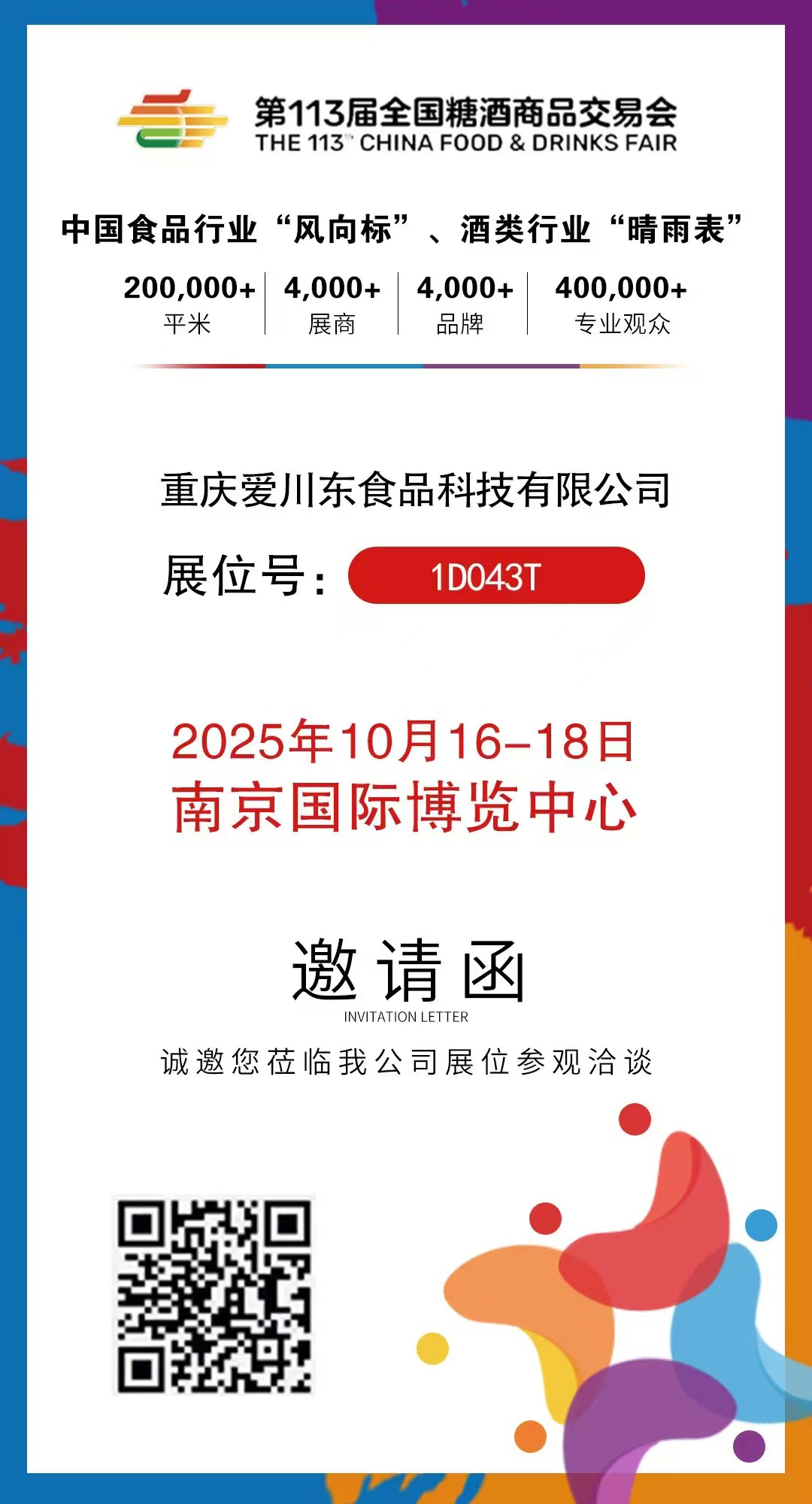 金秋十月,诚邀您拨冗莅临第113届秋季糖酒会“爱川东”展位(展位号:调味品馆1D043T),展会将于2025年10月16日—18日在南京国际博览城中心隆重举行。
